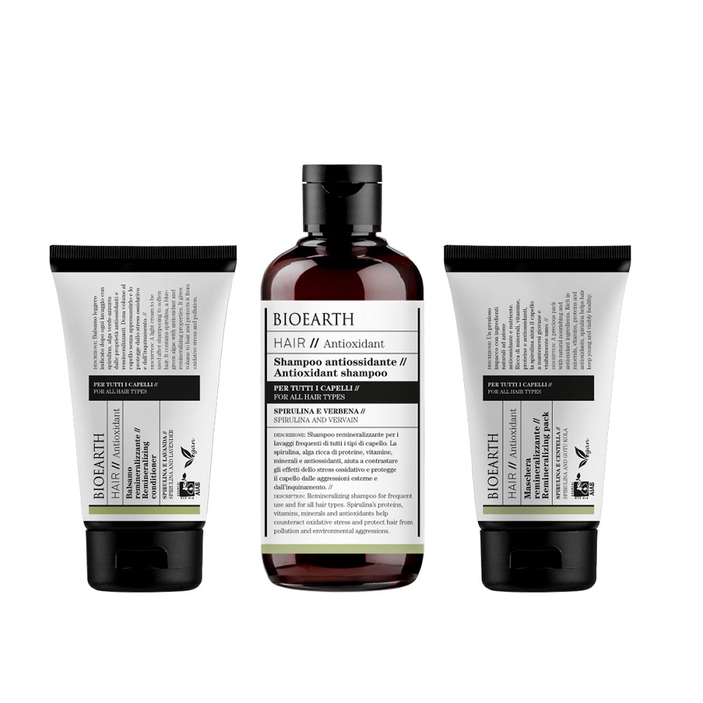 Jsou Vaše vlasy bez energie a života? Sami jste často ve stresu? Pohybujete se v náročných podmínkách (prach, smog), používáte denně stylingové přípravky a jednoduše cítíte, že vlasy potřebují ozdravnou kúru? Vsaďte na vysoce účinnou remineralizující péči BIOEARTH, která dodá vlasům potřebnou sílu a energii. Zlepšuje celkovou kvalitu vlasů, podporuje jejich růst a účinně chrání před znečištěním a agresivními vlivy životního prostředí. Obsahuje Spirulinu, Verbenu, Gotu Kolu, pšeničný protein, levanduli a další přírodní pečující složky.