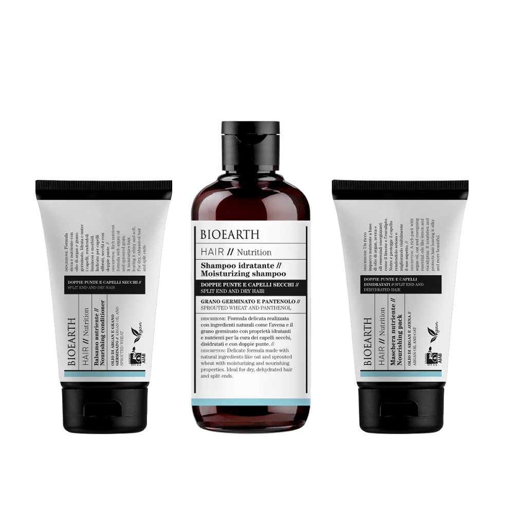 Jsou Vaše vlasy suché, lámavé, bez lesku? Trápí Vás roztřepené konečky? Vsaďte na vysoce účinnou hydratační péči BIOEARTH, která hloubkově hydratuje a vyživuje vlasy i pokožku hlavy. Obnovuje texturu vlasů, zabraňuje lámání, ochraňuje, posiluje a podporuje jejich přirozený lesk. Obsahuje pšenici, oves, Panthenol, arganový a citrónový olej a další přírodní pečující složky.